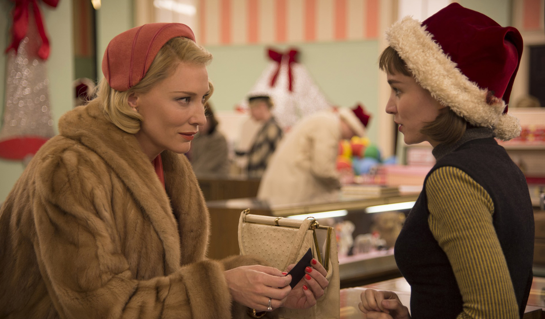 But while the discovery of attraction, the actions surrounding courtship, the day to day of puppy love, and the destructive nature of fifties hetero-normative culture are pristine in their focus, the first two acts are just plain dull. Haynes falls in love with his images – clothes, sets, objects, makeup and hair – to the extent that he, quite purposefully, lowers the volume of the dialogue so it becomes part of the imagery. This is all well and good, I suppose, but its Cate Blanchett and Rooney Mara falling in love before our eyes! Maybe I’m just too much of an aurally motivated movie-goer, but I WANT to hear what they’re saying! I found it incredibly frustrating, since there is only so much you can do with pastel palettes and thick ties wrapped ’round the collars of brown-fedora’d businessmen before you feel like you’re watching “Mad Men” with the sound off.
